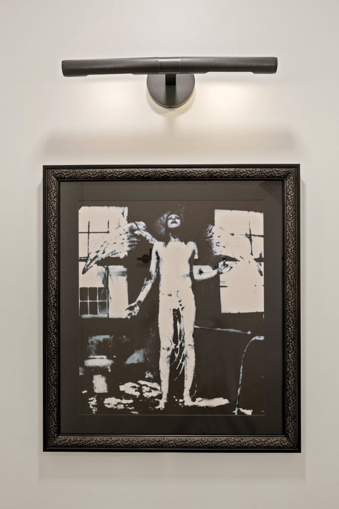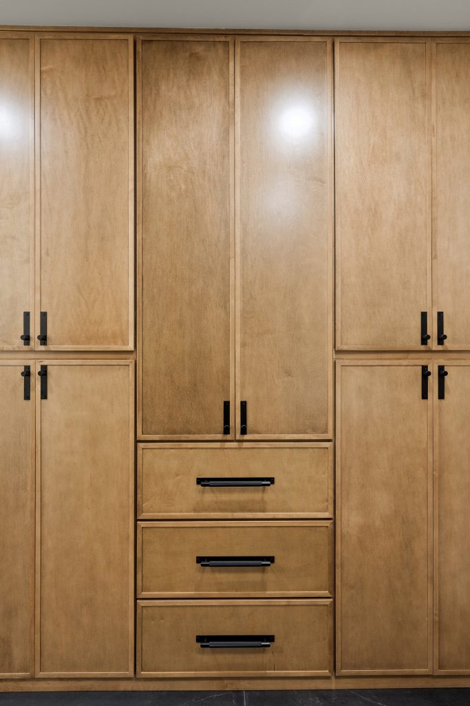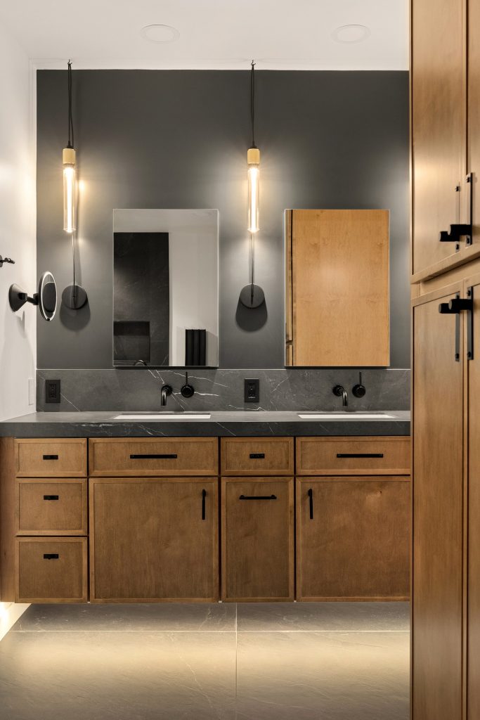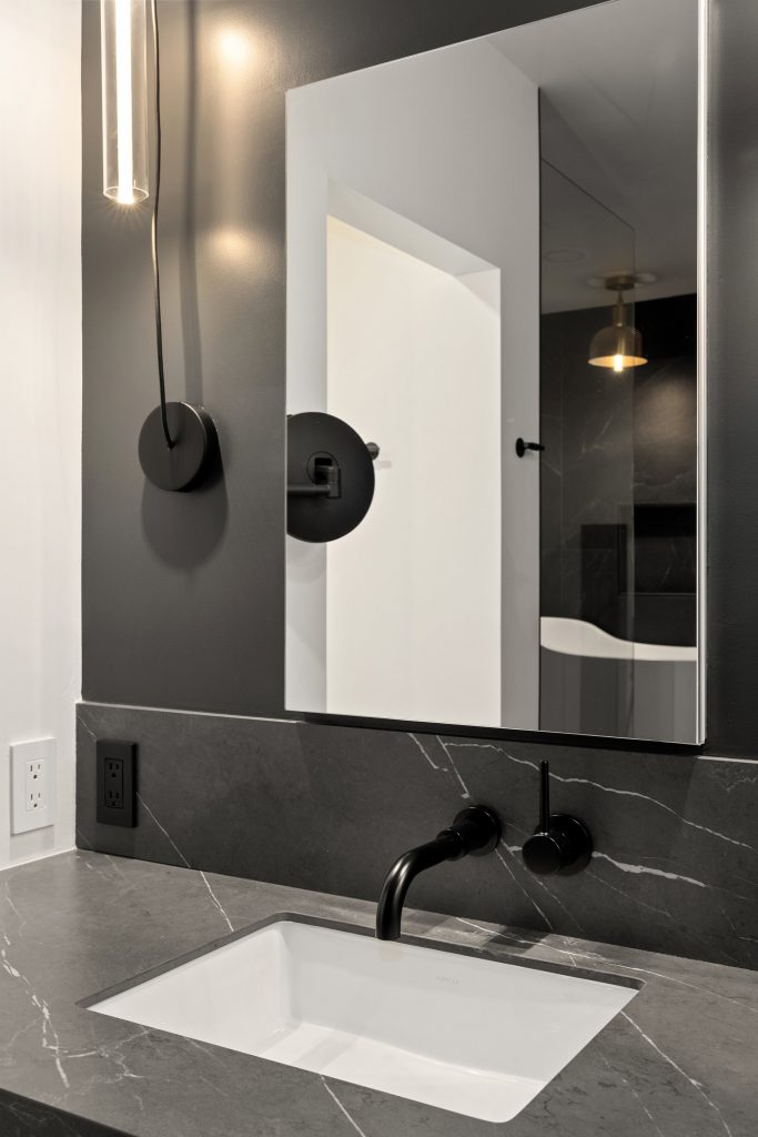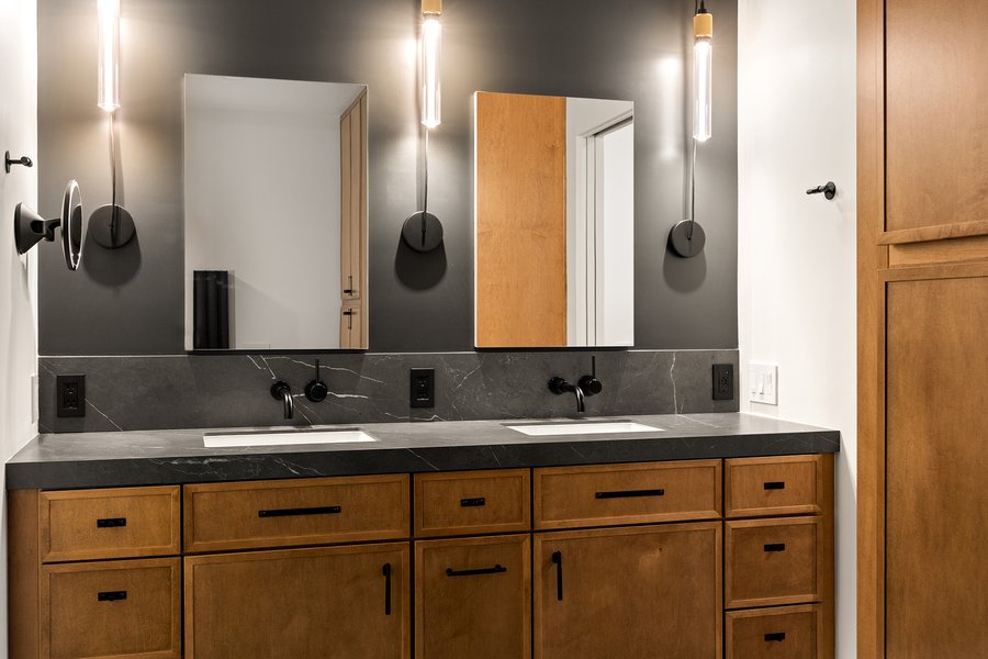 To balance the depth and drama, we introduced warm wood cabinetry and striking black stone countertops. The custom double vanity features wall-mounted faucets and vertical glass sconces that bring a soft, sculptural glow. A brass ceiling fixture adds just the right amount of warmth and contrast. This was more than just a renovation—it was a personal collaboration, resulting in a space that’s unapologetically stylish, deeply considered, and completely one-of-a-kind.