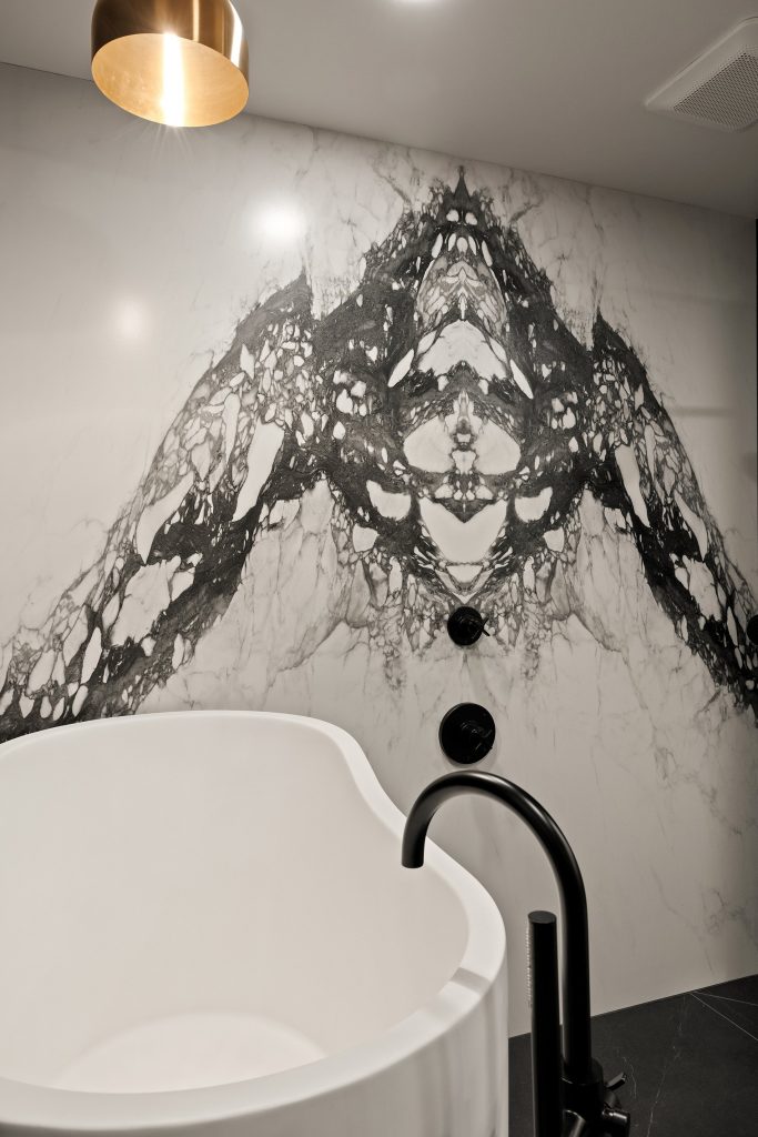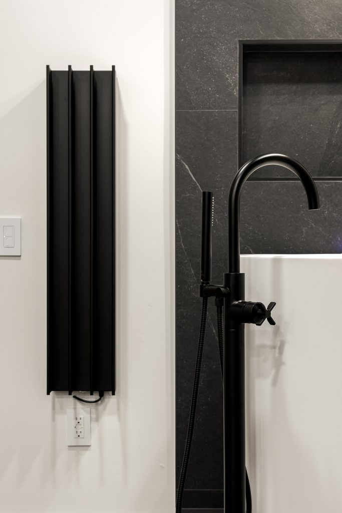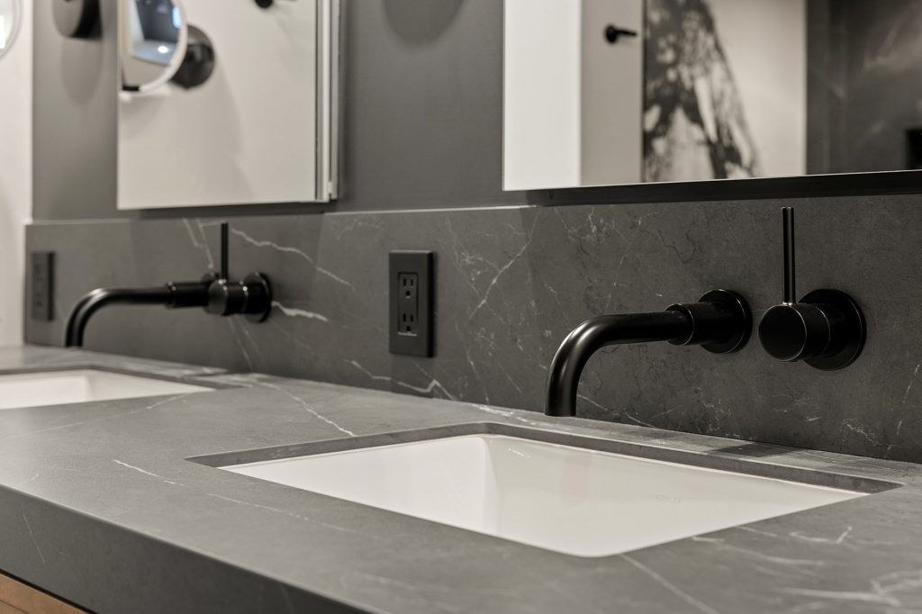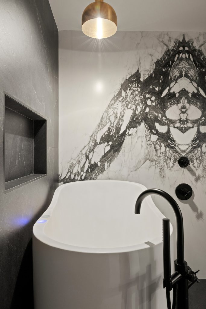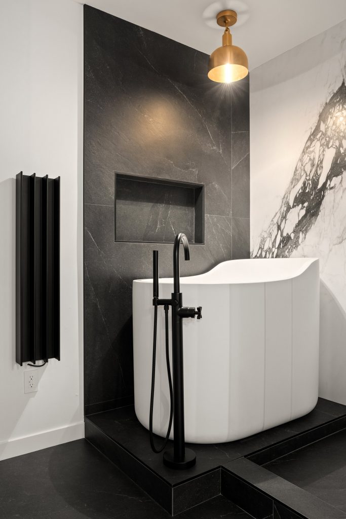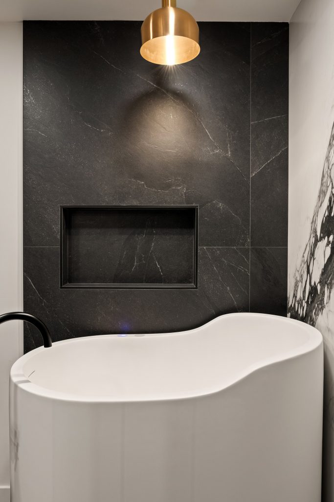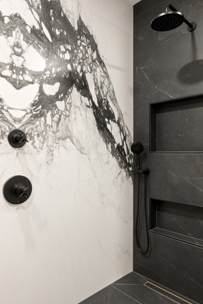For this remodel, we had the pleasure of working with longtime friends who also happen to have impeccable taste. The result is Goth Dreams—a bold, moody, and modern transformation that merges elegance with edge. We combined two existing rooms to create one dramatic, highly functional primary bathroom. A sculptural soaking tub stands as the focal point, framed by a bookmatched marble feature wall and sleek matte black fixtures. Rich black tile envelops the tub and shower surround, while built-in niches maintain a minimalist, organized feel.