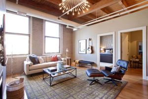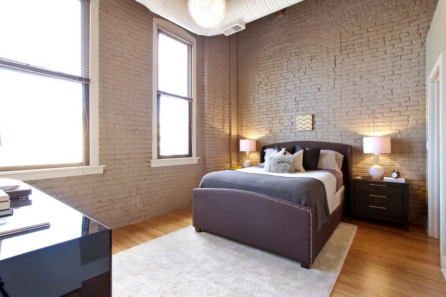The master bedroom had natural light pouring in and was ample space for a queen bed with space for chest of drawers to either side. The brick was painted gray and the ductwork a clean white. This kept the loft’s edge while still creating a clean and calming environment.