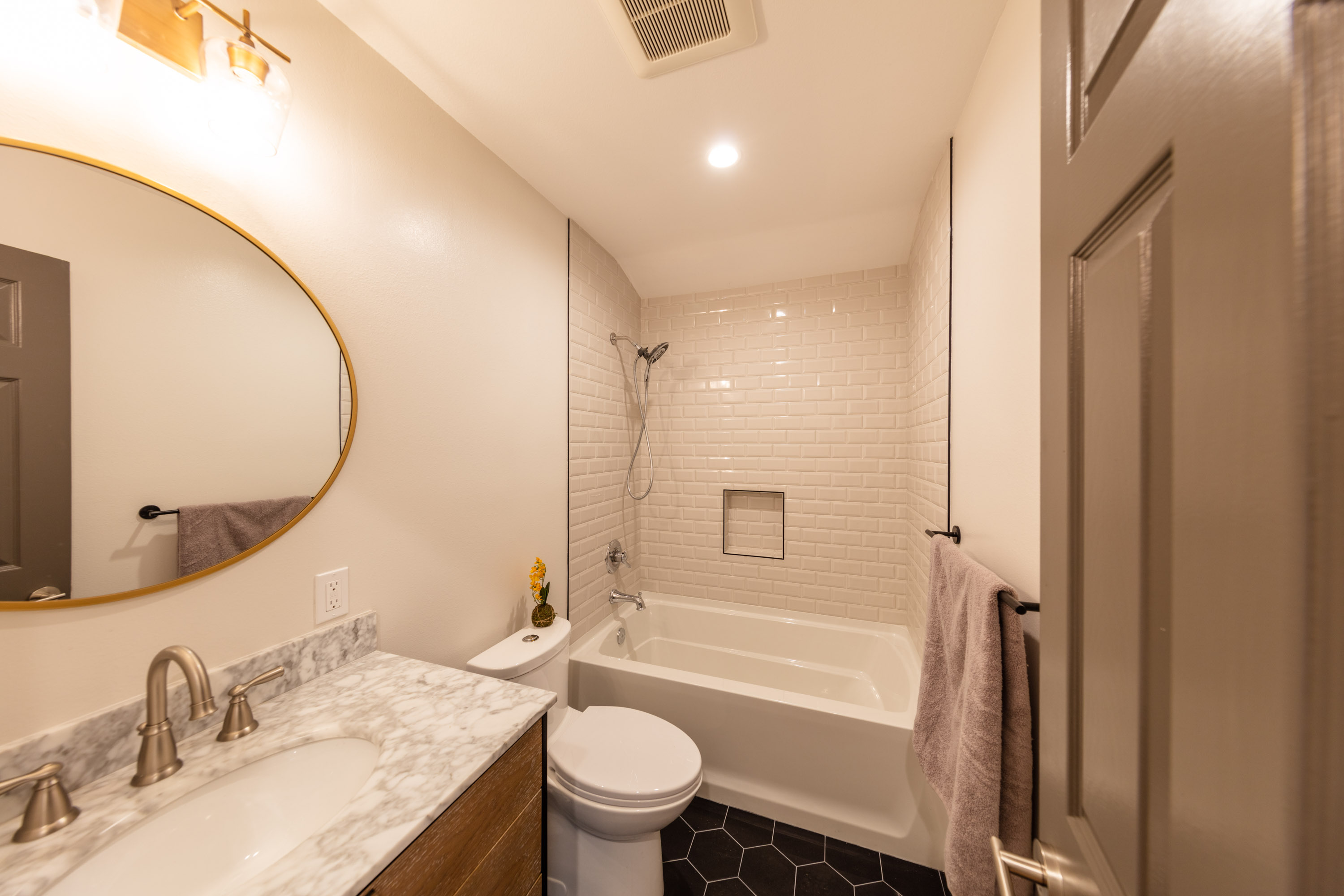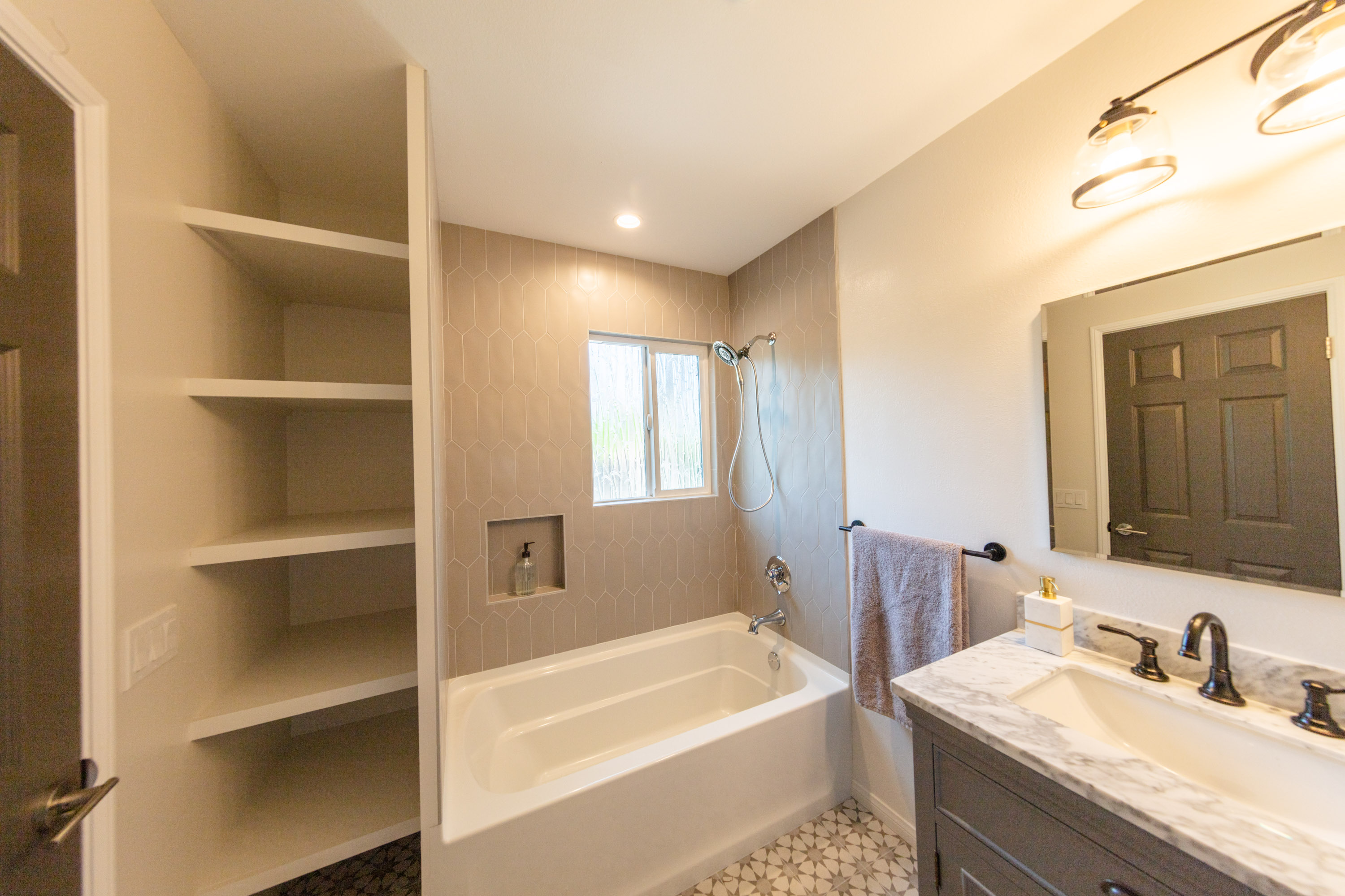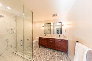 The master suite has new lighting, custom closets and a spa like bathroom. Dual sinks, a marble shower and custom wall sconces play off of the custom floor tile. It’s a modern but timeless design.