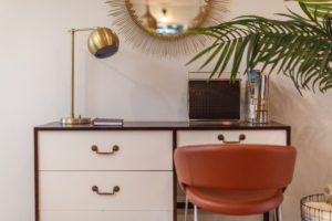 Now the home boasts a calm palate with distinguished finishes. The house has a weathered white wall color throughout. This embraces the calm, cool aesthetic of Southern California. The kitchen is a combination of black and white shaker cabinetry, calacatta gold, quartz counters, and brass details.