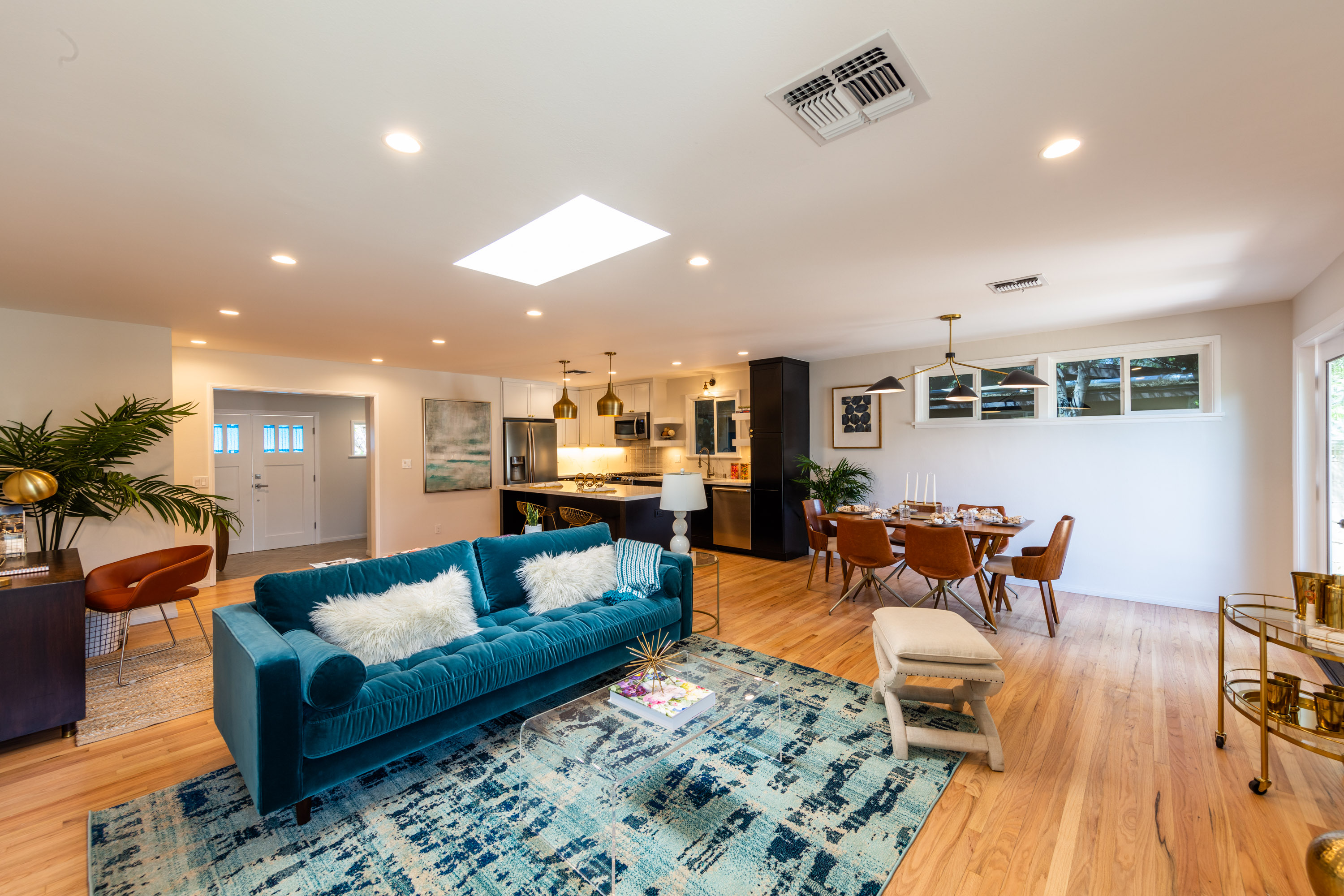 Mid century lighting anchors the dining space and pairs nicely to the original fire that centers the living room in the great room. Natural light pours into the space from the new recessed led lighting, French doors and large skylight.